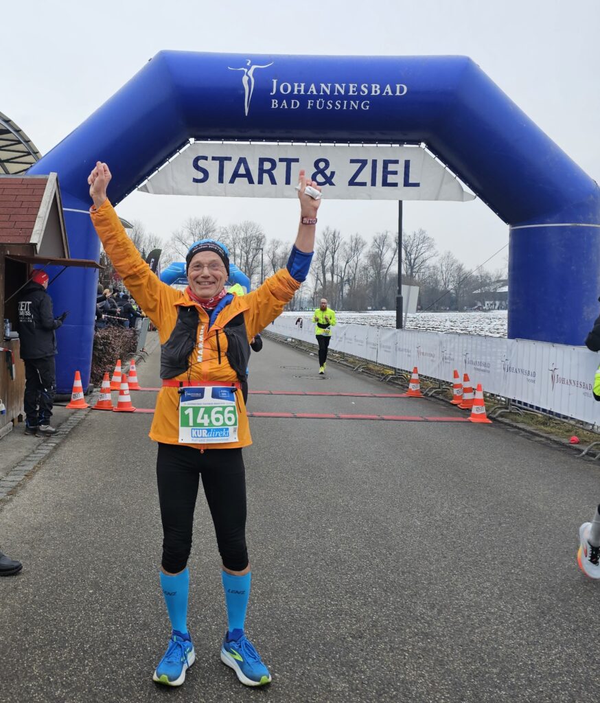 „Mein Wiederaufbau von unten: Nach 5K Nikolauf, 10K Silvesterlauf, war jetzt der HM Bad Füssing passend in meiner Timeline: 1:54:33 15. AK M65, damit hatte ich mein Ziel sub 2h locker mit einem leichten negativen Split erreicht. Temperatur um 0°, kein Wind! Tolle, nette Veranstaltung zu dieser Jahreszeit: Erst laufen, dann thermen…😄“